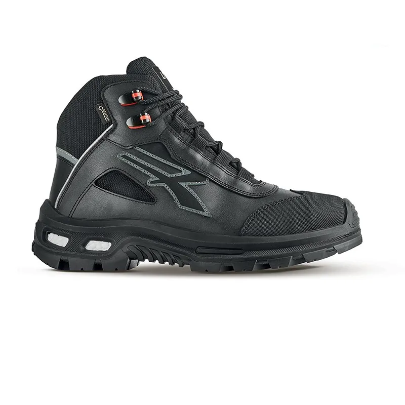 Scarpa antinfortunistica alta e comoda, della linea Red Over di U-Power, Morbida pelle fiore, inserti in textile e puntale antiabrasione, idrorepellente, puntale in composito, fodera Gore-Tex e suola in Soffice PU espanso e Infinergy®.